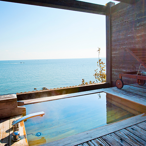 極上の「個」客室露天風呂早朝に上る清々しい朝日 夜空に瞬く満天の星・・・それぞれに魅せる海の表情を独占できる優雅な空間