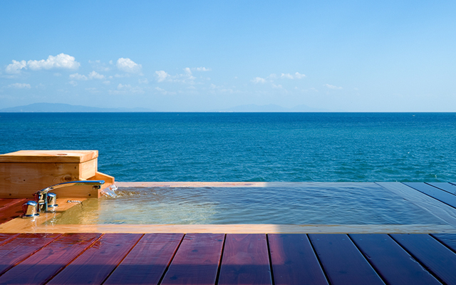 海の見える露天風呂付のお部屋が全6室入りたいときにお湯を溜めてご利用くださいませ。海に面した露天風呂にはシャワーと湯上りスペースがございます。シャンプーやボディソープを完備。夜はキャンドルをつけて幻想的な温泉時間もお楽しみいただけます。
