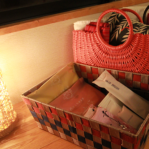必要なアメニティをお部屋に完備しております。バスタオル、フェイスタオル、湯たび、かごに入れて移動できるようにしています。