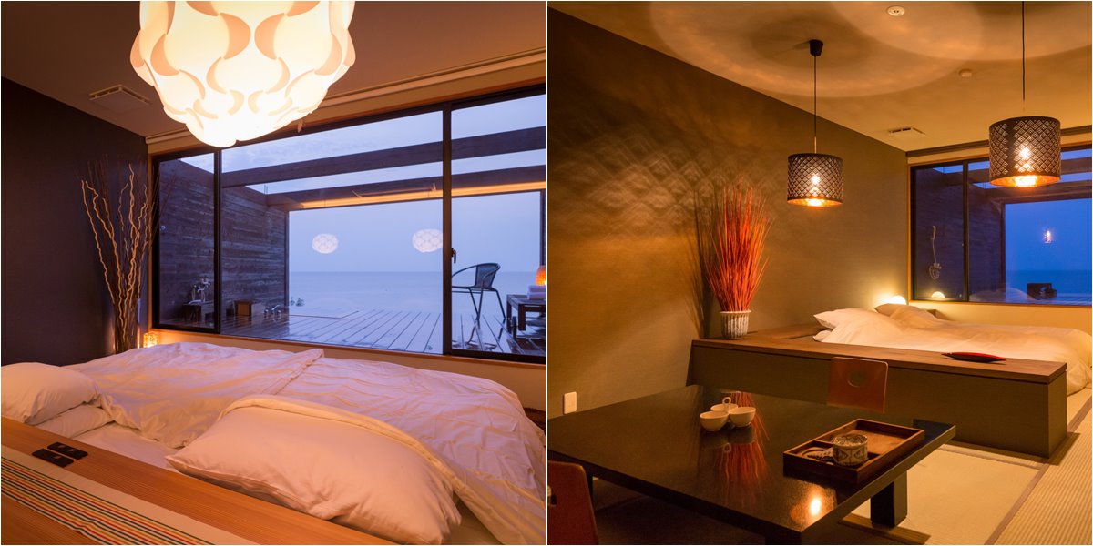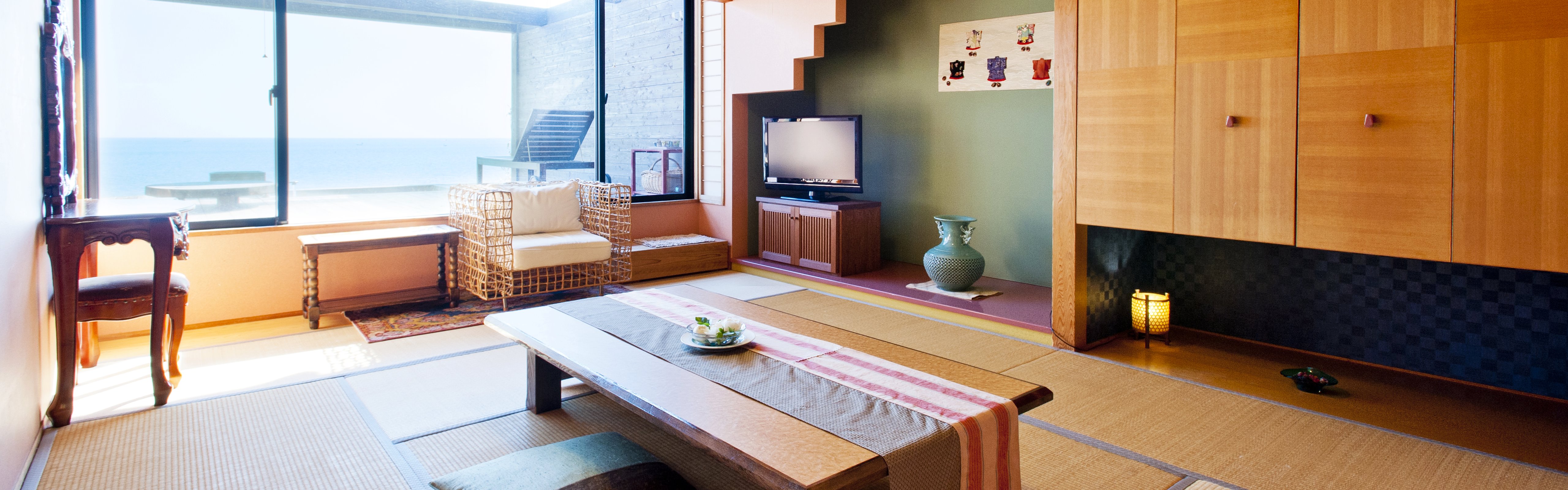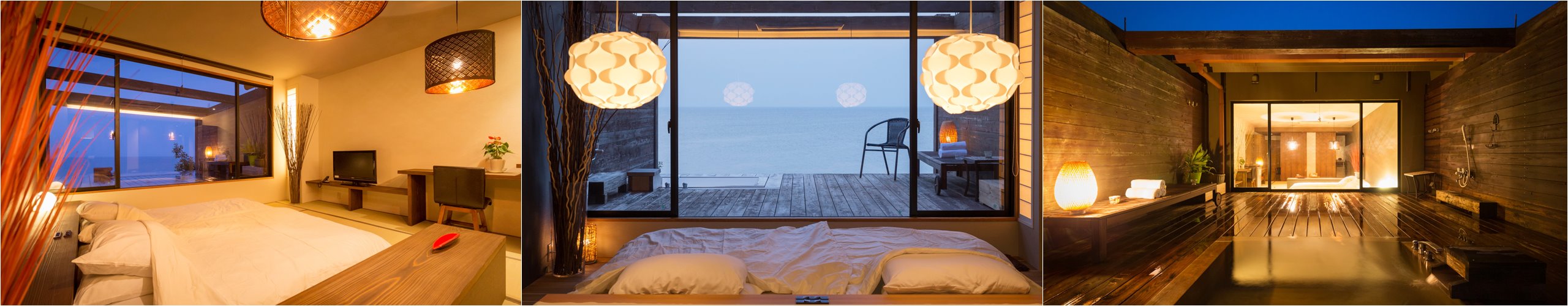 除了面对大海的客房之外,还有带有室内风吕浴池、风情迥然不同的和室。其中既有面积宽敞、可供多人或3代家族成员使用的大和室,也有适合不同人数使用的其他房型。