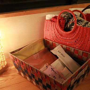 浴巾、毛巾、木屐襪等放置在小筐中,方便移動。